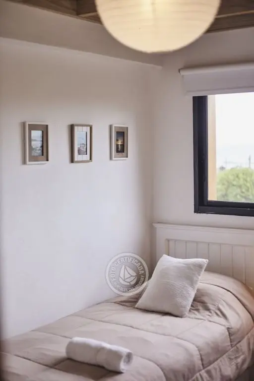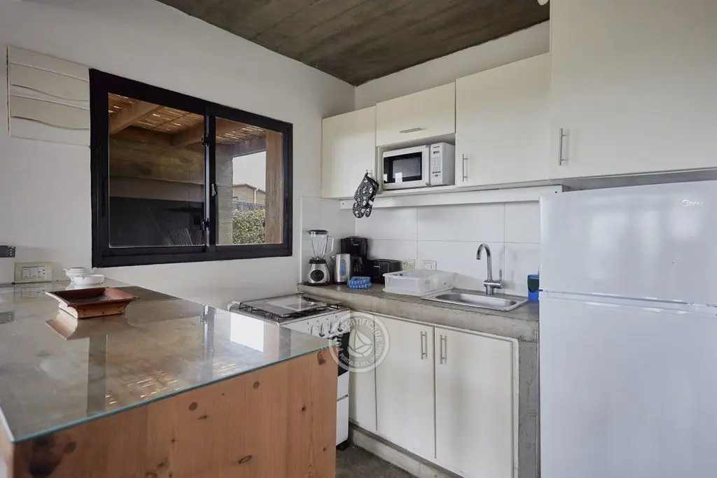 Cabaña en dos plantas con capacidad para 5 personas. Consta de un dormitorio matrimonial con vista al mar, blackout, sommier y aire acondicionado frío/calor. El otro dormitorio cuenta con 3 camas de una plaza. En planta baja, se encuentra el living, con TV de 32¨ con Direct TV y entrada usb para música y videos, estufa a leña, sillones, un gran ventanal y una barra de madera con banquetas que lo separan de la cocina, totalmente equipada. Una puertaventana divide al living del deck, con parrillero individual, hamaca y juego de mesa y sillas.